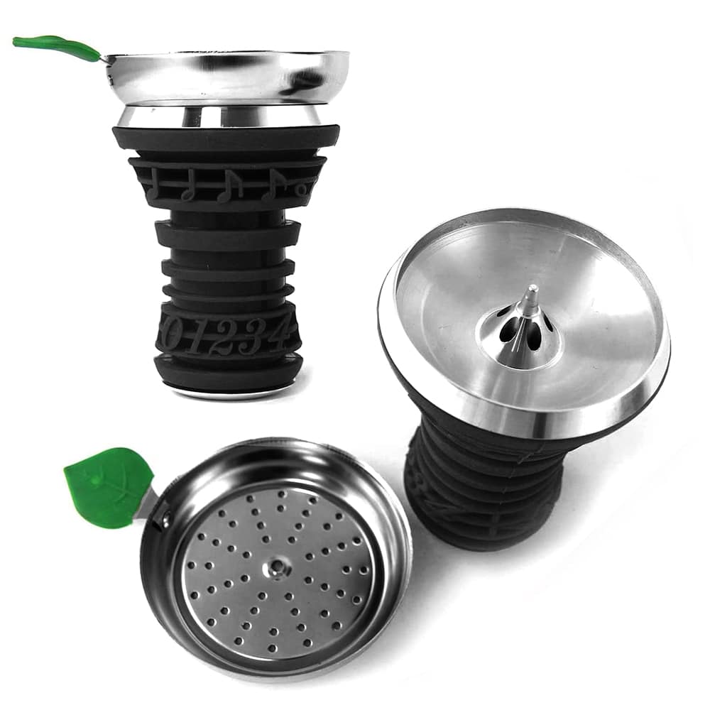 Μεταλλική βάση ναργιλέ κατασκευασμένη από αλουμίνιο, με όμορφο 3D σχέδιο αριθμών και μουσικών νοτών από σιλικόνη. Διαθέτει επιπλέον σίτα για τα κάρβουνα με χειρολαβή από καουτσούκ με σχήμα φύλλου σε πράσινο χρώμα.