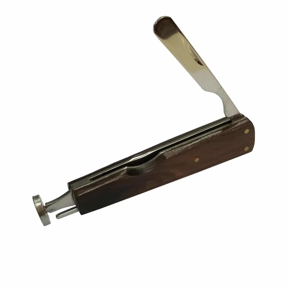 Αυτό το μεταλλικό εργαλείο καθαρισμού σε μοντέρνο σχέδιο πίπας με επένδυση σκούρου ξύλου διαθέτει ένα μακρύ στέλεχος, επίπεδη ξύστρα για το μπολ και η βάση του χρησιμοποιείται ως tamper για τον καπνό.
