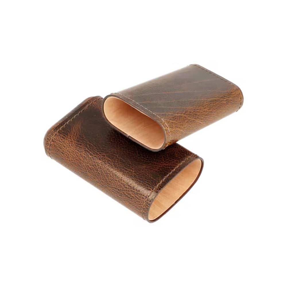 Δερμάτινη πουροθήκη σε σκούρο καφέ χρώμα και εξώραφα, με βουρτσισμένο vintage δέρμα και επένδυση ισπανικού κέδρου. Μπορεί να χωρέσει 2-3 πούρα ανάλογα με το μέγεθος.