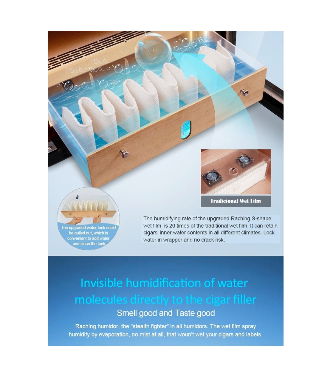 Μηχανική Υγρανση: Με μοτέρ ακριβείας, η μηχανική υγρανση εξασφαλίζει ομοιόμορφη διανομή σταθερής υγρασίας μεταξύ 60-75% σε όλα τα ράφια, αναπτύσωντας τις ιδανικές συνθήκες για τα πούρα σας.
