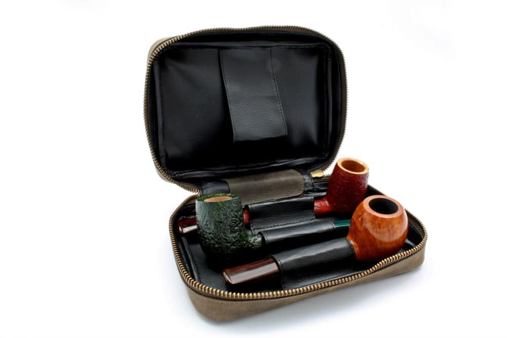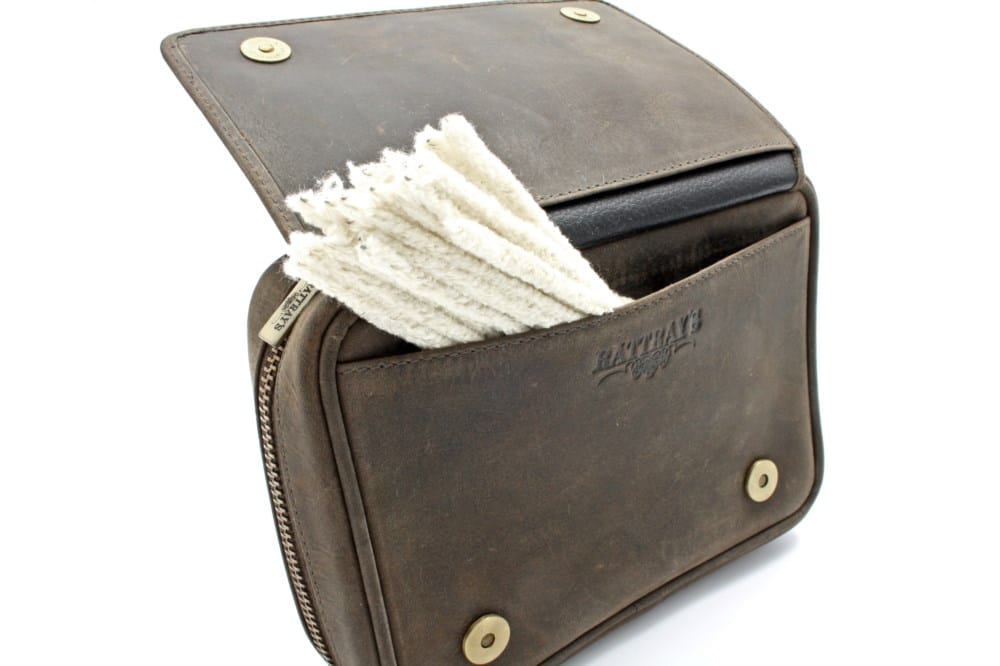 Μια πρακτική θήκη από τη Rattray’s σε καφέ ματ μαλακό 100% δέρμα cowhide με διακριτικό σήμα της εταιρείας. Έχει θέσεις για τρεις πίπες καπνού και ειδική θέση για να τοποθετείτε τον καπνό σας ή τη δερμάτινη καπνοσακούλα σας. Κλείνει περιμετρικά με εξαιρετικής ποιότητας φερμουάρ και λειτουργεί σαν ένα κομψό και βολικό τσαντάκι. Στο εξωτερικό του διαθέτει έναν ακόμα άνετο χώρο για τα καθαριστικά, το tamper ή τα φίλτρα σας.