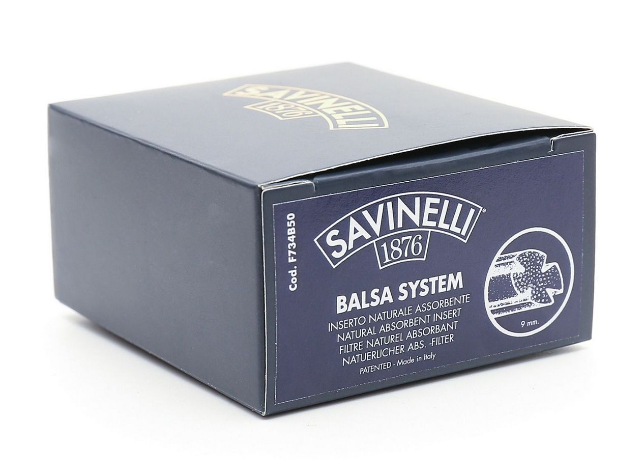 Το φίλτρο Balsa της Savinelli είναι ένα σύστημα φιλτραρίσματος που χρησιμοποιεί τις φυσικές ιδιότητες του ξύλου balsa . Επιτρέπει την απορρόφηση της υγρασίας και τις ακαθαρσίες από τον καπνό, χωρίς την προσθήκη χημικών στοιχείων, εξασφαλίζοντας ένα καθαρό κάπνισμα. Αυτή η ικανότητα απορρόφησης είναι λόγω των εξαιρετικά πορώδων ινών της balsa, χωρίς να αλλοιώνεται η γεύση και το άρωμα του καπνού. Αυτό το πατενταρισμένο σύστημα φιλτραρίσματος έχει δοκιμαστεί τόσο από την EURATOM Research Center of Ispra και από το CHEMICAL & ENVIRONMENTAL TECHNOLOGY Inc. Research Center (USA) με περίπου τα ίδια αποτελέσματα: “Tο φίλτρο Balsa έχει τη δυνατότητα να απορροφήσει το 77% της νικοτίνης και το 91% της πίσσας που περιέχεται στον καπνό χωρίς να αλλοιώνεται η γεύση του ίδιου.” Το φίλτρο είναι απλό και εύκολο στη χρήση. Η Savinelli συνιστά να αντικαθιστάτε το φίλτρο κάθε δύο-τρία καπνίσματα ή κάθε φορά που καθαρίζετε το επιστόμιο. Το κάθε πακέτο περιλαμβάνει 50 φίλτρα.