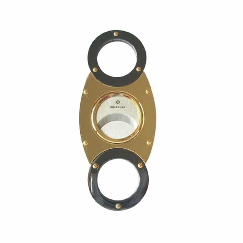 Μεταλλικός κόπτης πούρων διπλής γκιλοτίνας της Sikarlan από ανοξείδωτο ατσάλι σε χρώμα χρυσό & τιτάνιο.