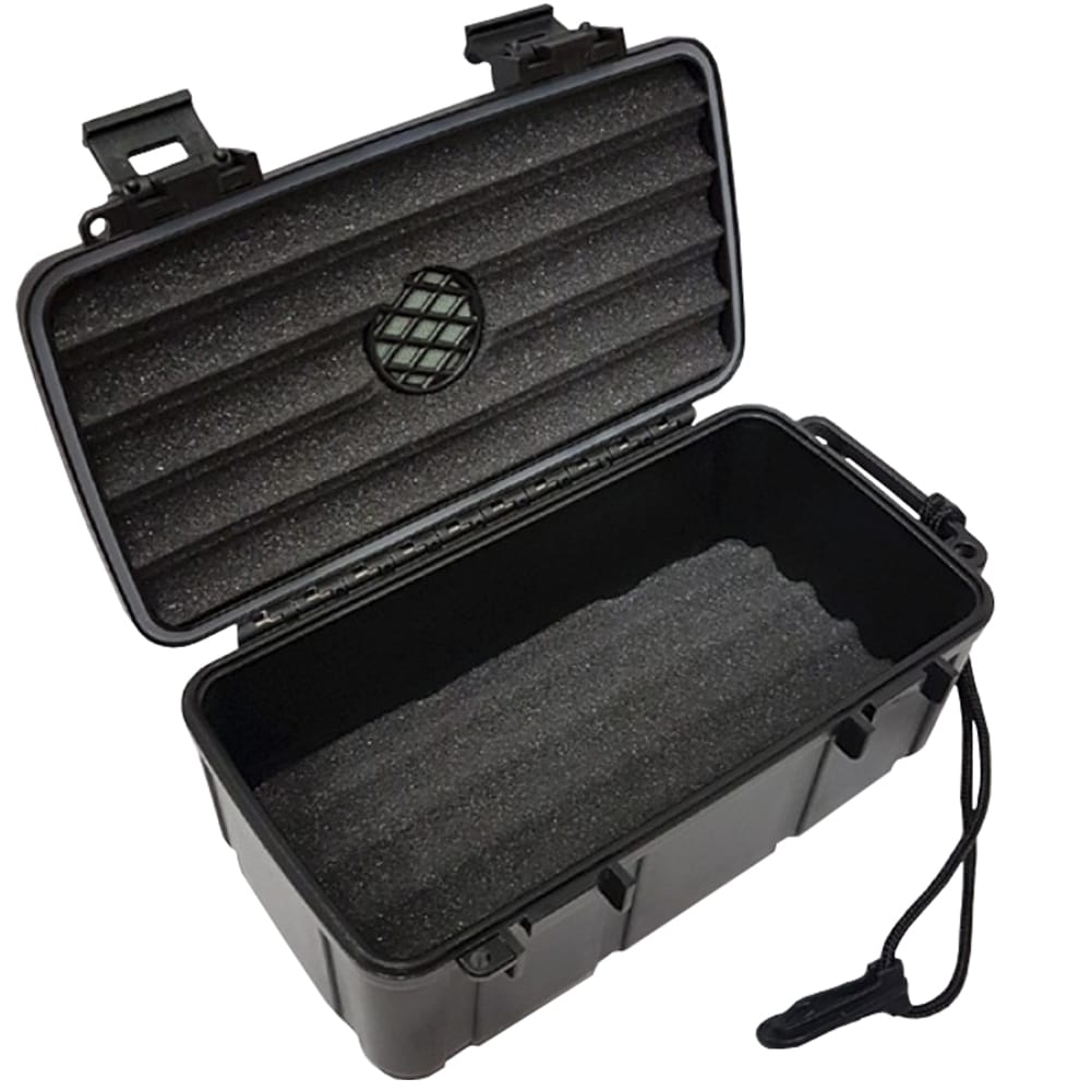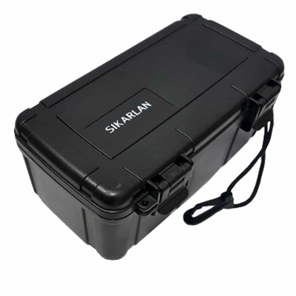 Υγραντήρας / humidor πούρων ταξιδιού της Sikarlan, κατασκευασμένος από συμπαγές πλαστικό. Κλείνει αεροστεγώς με 2 κλιπ ασφαλείας και είναι αδιάβροχος.