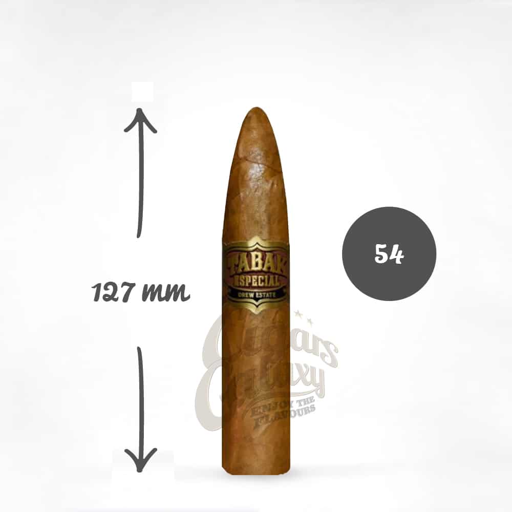 Το Tabak Especial Belicoso διαθέτει ένα μεταξένιο wrapper Connecticut και το μοναδικό μείγμα της Drew Estate από παλαιωμένο binder και long filler Νικαράγουας για να δημιουργήσει έναν δελεαστικό καπνό σε στυλ καφέ. Η γήινη υφή των καπνών της Νικαράγουας αναμειγνύεται άψογα με τα αποστάγματα των πλούσιων κόκκων καφέ Νικαράγουας για να δημιουργήσει έναν καπνό που είναι λεπτός και εξαιρετικά αρωματικός.