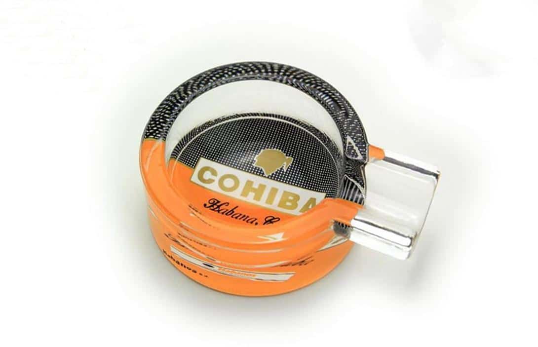 Διάφανο, γυάλινο σταχτοδοχείο για ένα πούρο με χρώματα και λογότυπο της Cohiba.