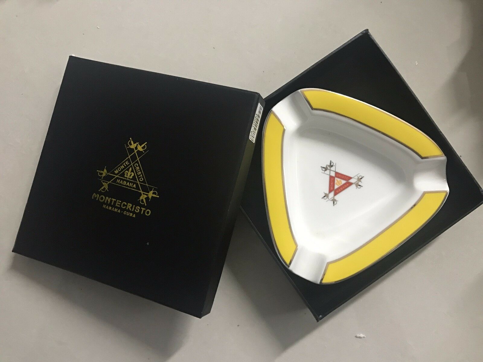 Κεραμικό σταχτοδοχείο για 3 πούρα σε τριγωνικό σχήμα, κίτρινο και λευκό χρώμα και λογότυπο της Montecristo.