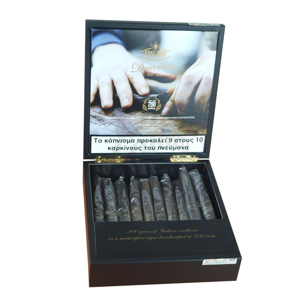 Η γνωστή ιταλική εταιρεία παραγωγής πούρων Toscano για να γιορτάσει τα 200 χρόνια λειτουργίας της λανσάρει φέτος ένα νέο συλλεκτικό πούρο το Toscano Duecento. Εξ’ ολοκλήρου χειροποίητο με παλαίωση 12 μηνών, ένα μέτριο προς γεμάτο πούρο, και με wrapper Usa Fire Cured Kentucky και filler Italian και Usa Fire Cured Kentucky σε ένα πολύ όμορφο ξύλινο κουτί των 20 τμχ με λογότυπα με χρυσοτυπία αποτελεί το κόσμημα της Toscano.