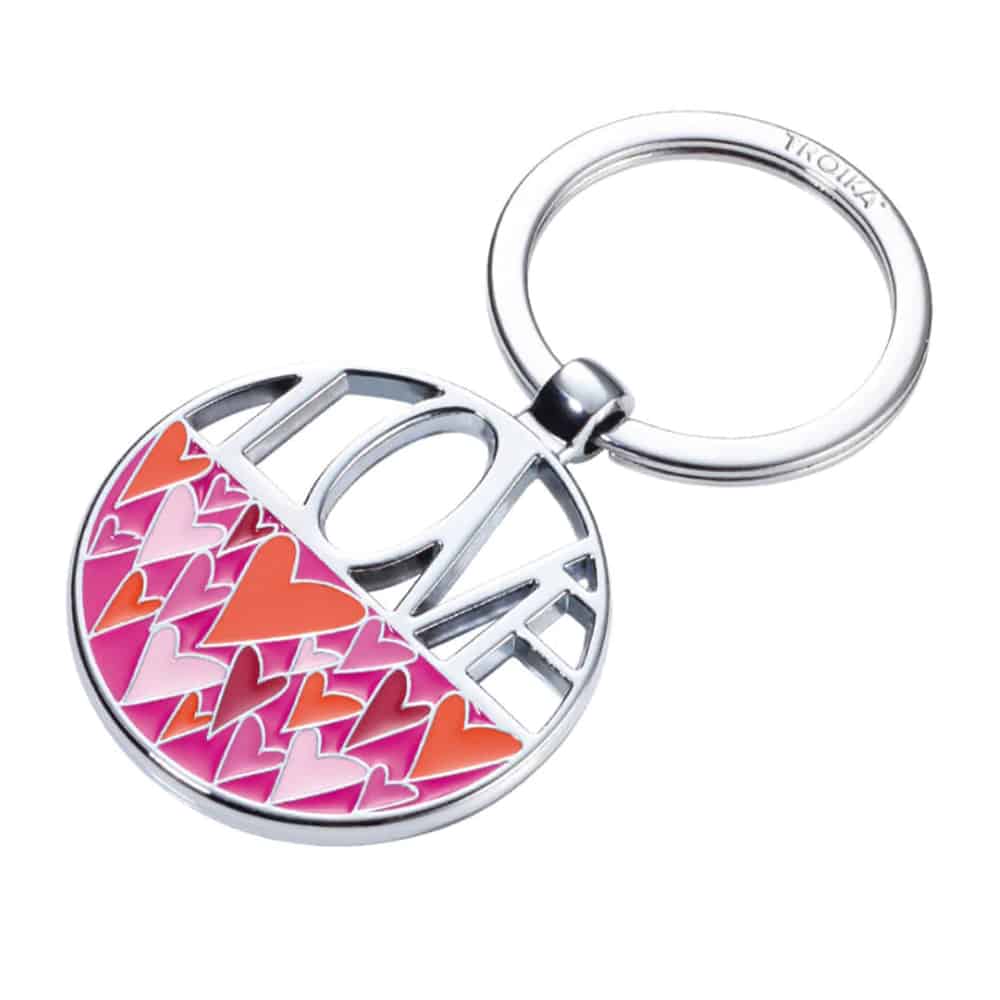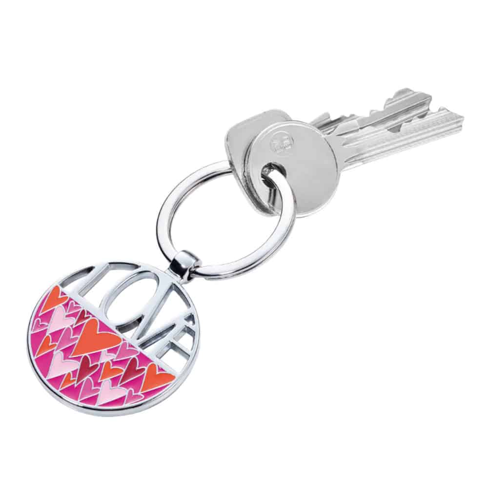 Μπρελόκ, στρογγυλό, με ανάγλυφα γράμματα “LOVE” και χρωματιστές καρδιές.
