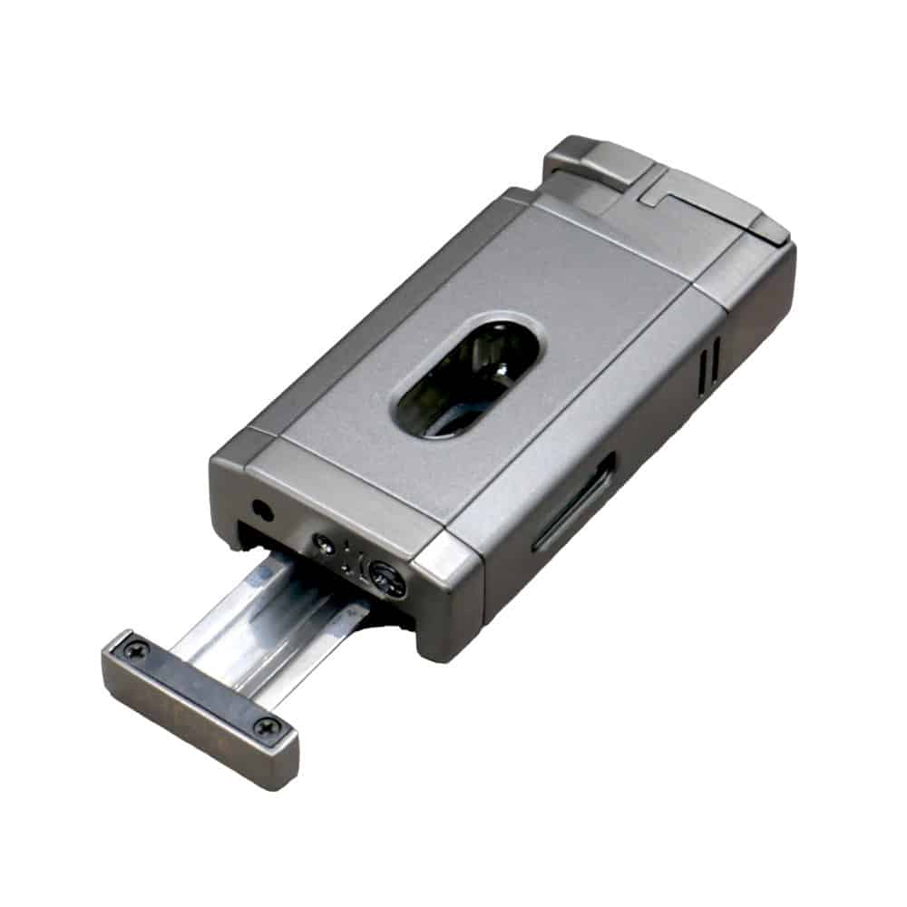 Αναπτήρας Winjet με ενσωματωμένο πουροκόφτη σε gunmetal χρώμα. Πατώντας το πλευρικό κουμπί προς τα κάτω, το επάνω μέρος ανοίγει αυτόματα και τα δύο ακροφύσια αναφλέγονται. Χάρη στο παράθυρο στο πλάι, μπορείτε να ελέγξετε τη στάθμη αερίου στον αναπτήρα. Στο πισω μέρος του αναπτήρα, υπάρχει ένας πουροκόπτης τύπου v-cut . Στο κάτω μέρος υπάρχει βαλβίδα πλήρωσης αερίου με ρύθμιση φλόγας. Ο αναπτήρας παραδίδεται σε συσκευασία δώρου.