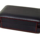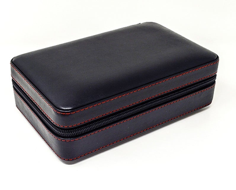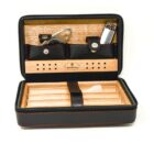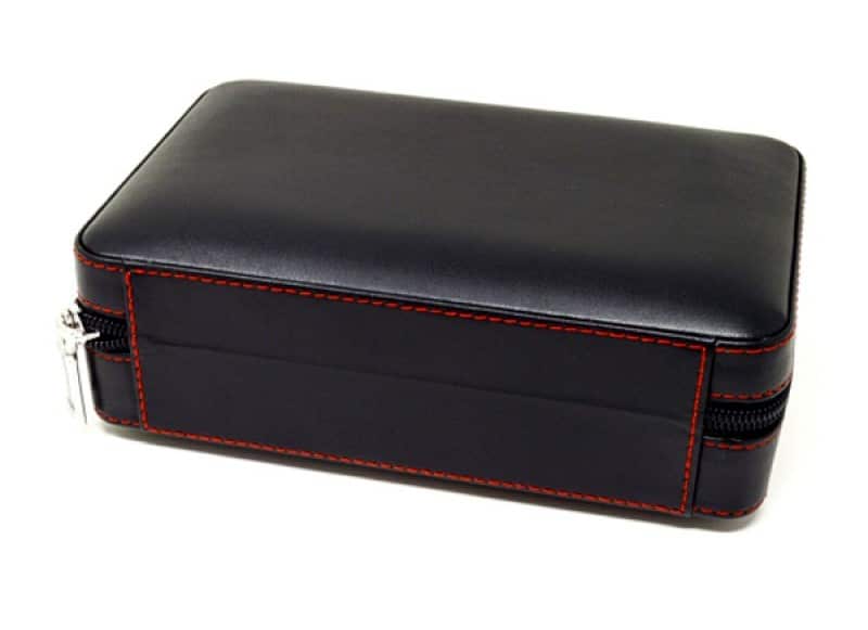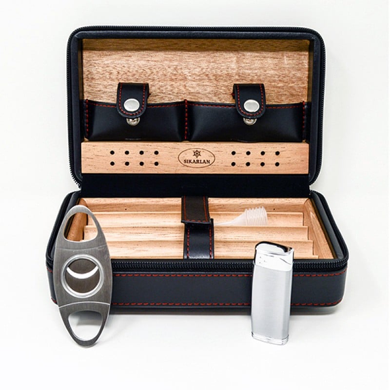 Δερμάτινος υγραντήρας / humidor πούρων ταξιδιού της Sikarlan με αναπτήρα jet μονής φλόγας και ατσάλινο πουροκόπτη γκιλοτίνα σε μαύρο χρώμα με κόκκινες ραφές ενώ κλείνει με φερμουάρ για μεγαλύτερη ασφάλεια. Έχει εσωτερική επένδυση κέδρου με αποσπώμενη θήκη για τέσσερα πούρα. Το υγραντικό στοιχείο βρίσκεται σε διάτρητη κέδρινη θήκη με ειδικό απλικατέρ για την τοποθέτηση του απιονισμένου νερού.