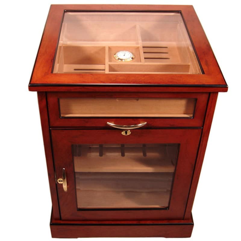 Ξύλινος υγραντήρας cabinet, βιτρίνα με εσωτερική επένδυση ισπανικού κέδρου, ματ φινίρισμα, τζάμι στο επάνω μέρος και στην πόρτα. Περιλαμβάνει δύο ράφια από κέδρο, μεντεσέδες σε χρυσό χρώμα, ένα αναλογικό υγρόμετρο, τέσσερα μεγάλα υγραντικά στοιχεία, μια κλειδαριά με δύο κλειδιά και συρτάρι με τέσσερα διαχωριστικά.