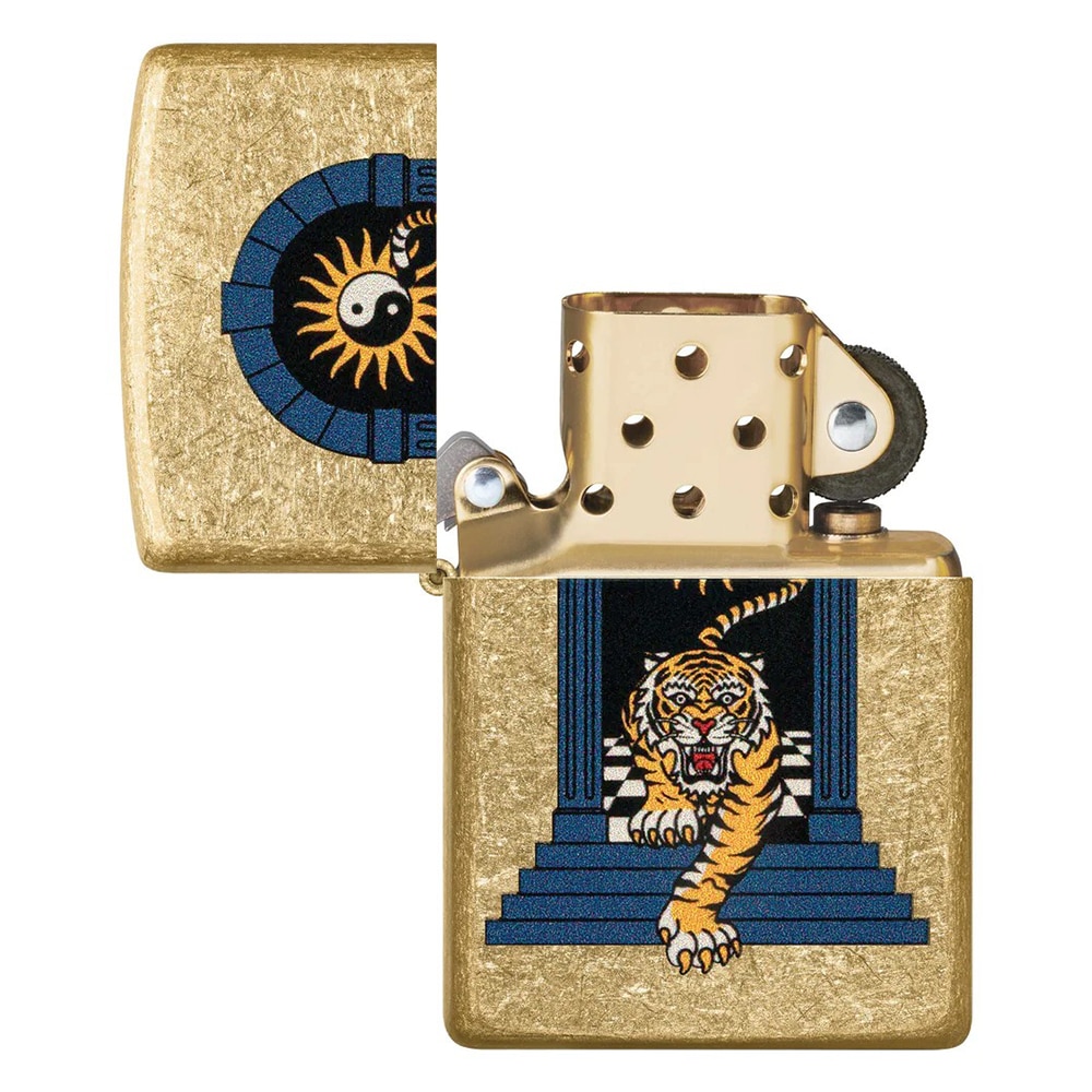 Ο τολμηρός σχεδιασμός έγχρωμης εικόνας υψηλής αντίθεσης σε αυτόν τον κλασικό αναπτήρα τύπου Tumbled Brass απεικονίζει την πάντα ισχυρή και μεγαλοπρεπή τίγρη να εμφανίζεται στο προσκήνιο κάτω από το σύμβολο της απόλυτης ισορροπίας, το yin-yang.