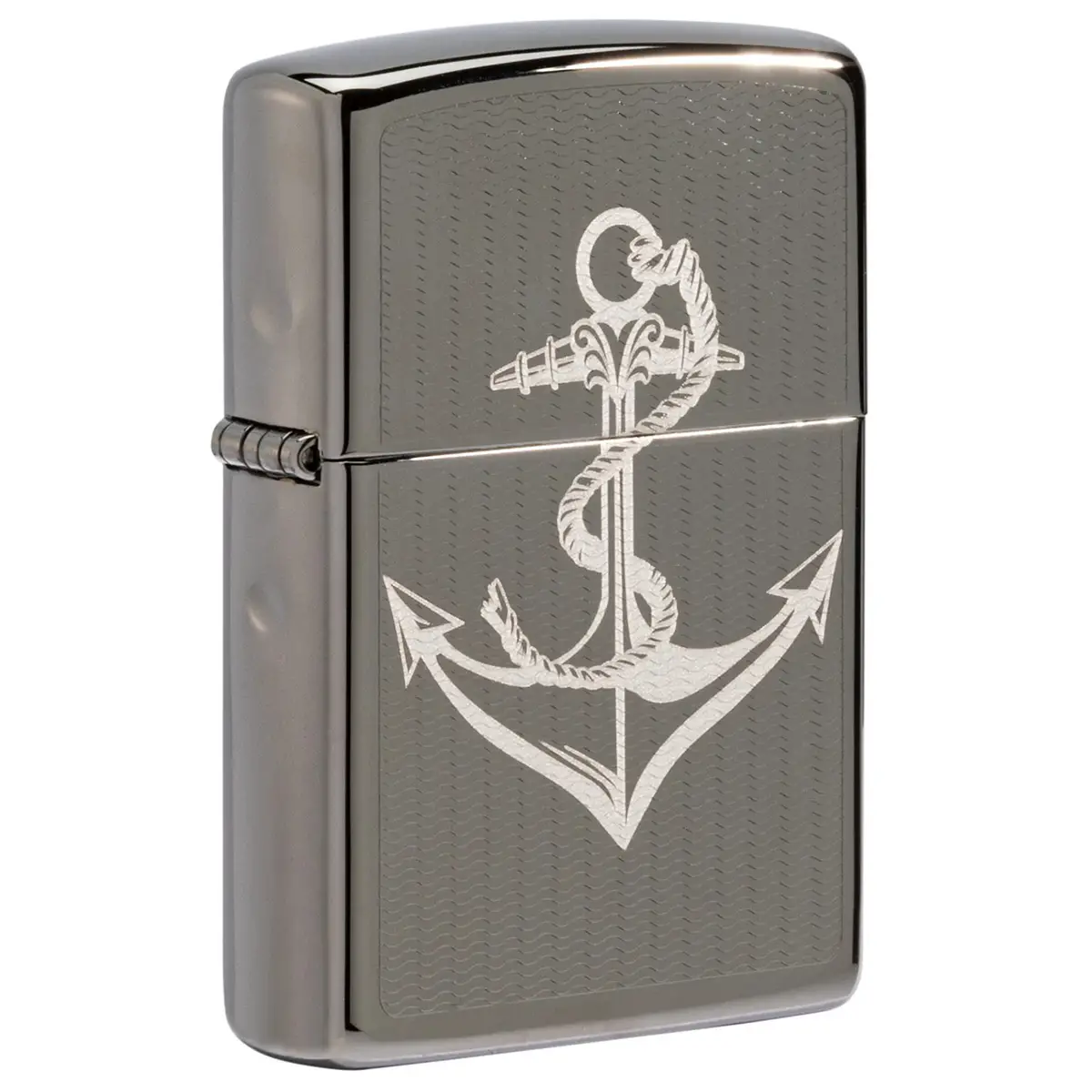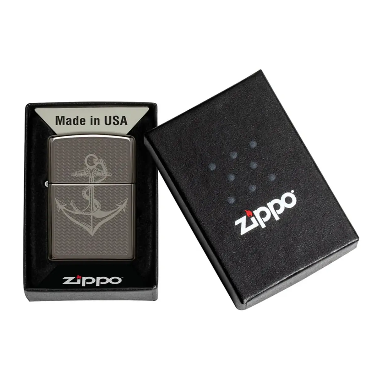 Η Zippo εντυπωσιάζει με ένα λιτό αλλά σαφές ναυτικό σχεδιασμό — μία άγκυρα χαραγμένη επάνω σε Black Ice φινίρισμα, που δημιουργεί μια μοντέρνα και ρετρό αισθητική ταυτόχρονα. Το “Black Ice” χαρίζει ανθεκτική, σκούρα και μεταλλική λάμψη.