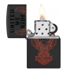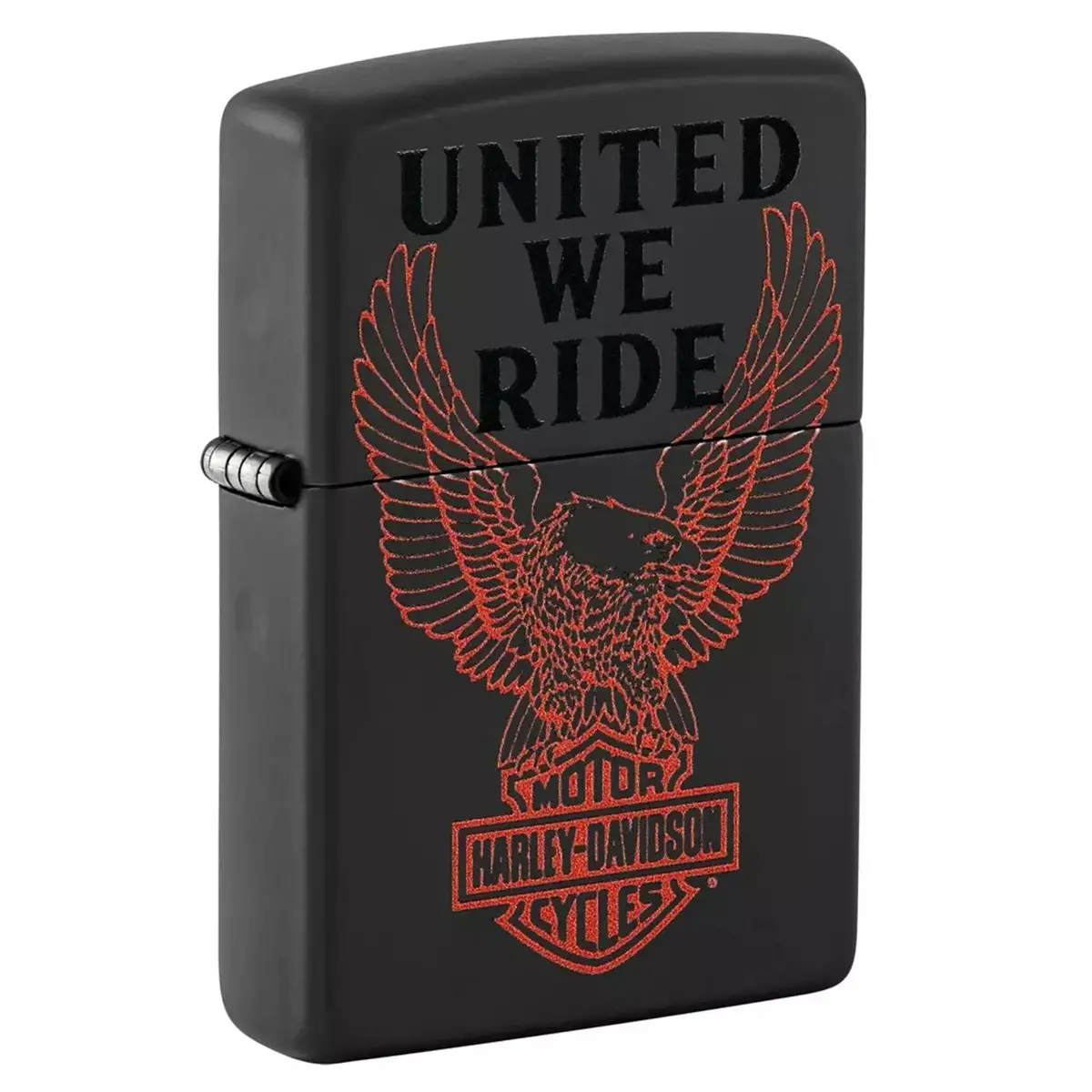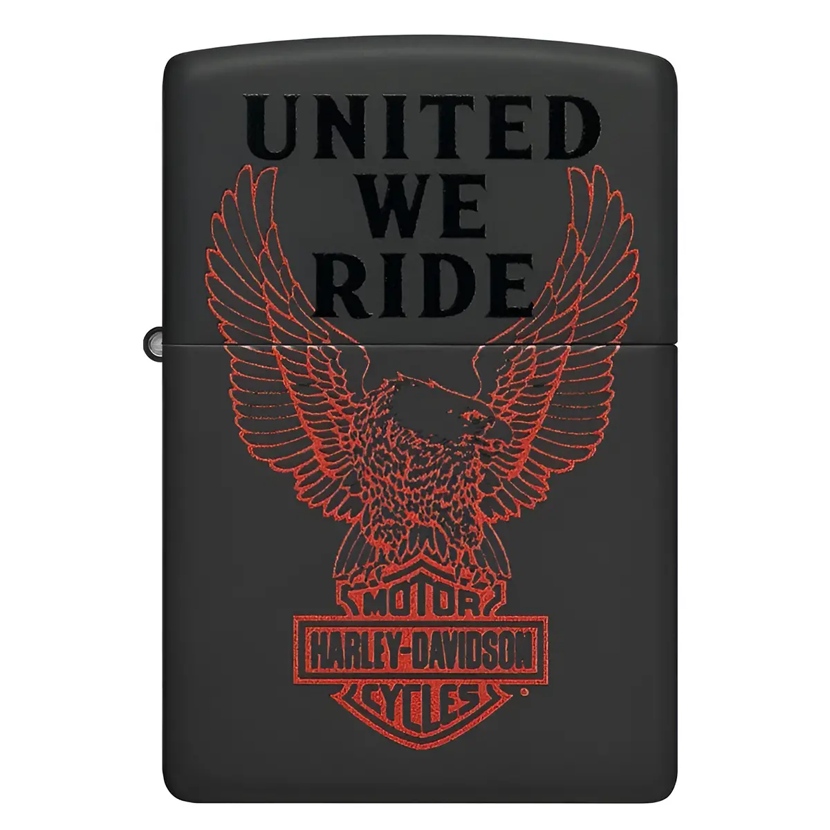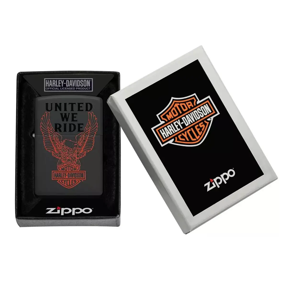 Η Zippo αποτυπώνει τη δύναμη και την ελευθερία της Harley-Davidson με το εμβληματικό σχέδιο του αετού και την επιγραφή “United We Ride”. Το ματ μαύρο φινίρισμα του χαρίζει μοντέρνα και στιβαρή εμφάνιση, ενώ αποτελεί και ξεχωριστό συλλεκτικό κομμάτι. Διατίθεται σε οικολογική συσκευασία δώρου.